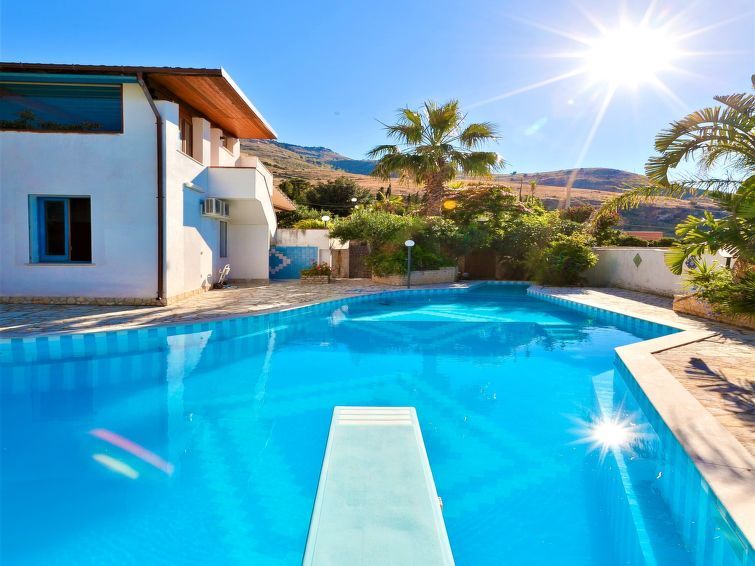 Villa "Le Palme", omgeven door bomen. In het gehucht Bonagia, 4.5 km van het centrum van Valderice, 11 km van het centrum van Trapani, geïsoleerde, rustige, zonnige ligging villa wijk, 1.5 km van zee, 2 km van het strand. Voor alleengebruik: terrein 600 m2 (omheind), tuin op verschillende niveaus bloemen en bomen, openluchtzwembad (9 x 11 m, seizoensgebonden beschikbaarheid: 01.Apr. - 31.Okt.). Buitendouche, tuinmeubelen, barbecue, onderhoud zwembad door de eigenaar/tuinman. Verwarming alleen beschikbaar van 01.Dec. - 31.Mrt.. Trappenweg (4 treden) naar het huis. Openbare parkeerplaatsen in de straat. Supermarkt 1.5 km, restaurant 2 km, bar 2 km, bushalte 12 km, treinstation "Trapani" 12 m, veerboot "Trapani Aliscafi per Isole Egadi" 12 km, stenenstrand "Bonagia" 2 km. Attracties in de buurt: Grotta di Mangiapane 9 km, Erice 12 km, San Vito lo Capo 28 km, Parco Archeologico di Segesta 35 km, Marsala-Saline 40 km, Palermo 95 km. Wandelgebied Riserva Naturale Monte Cofano 11 km, Riserva Naturale dello Zingaro 39 km. Auto noodzakelijk.
