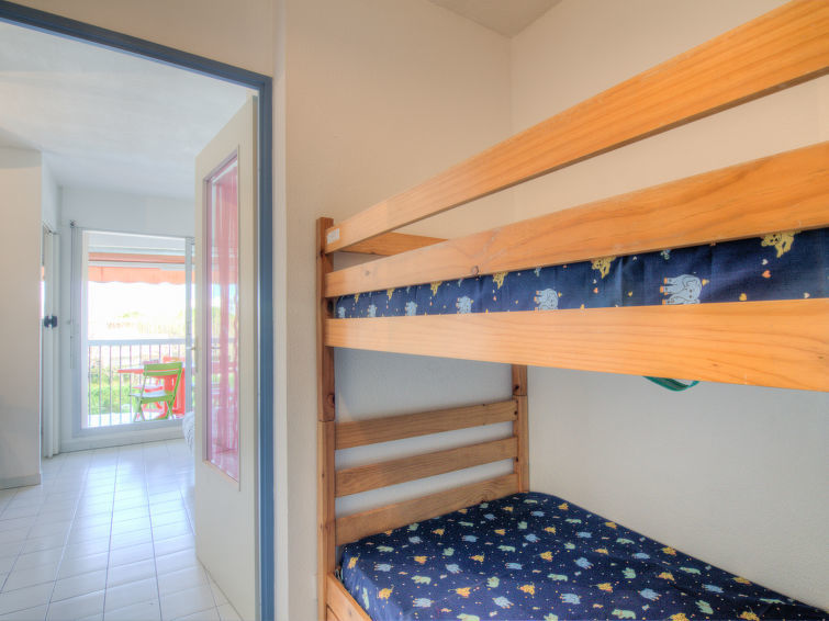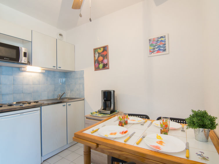 Appartement 2-kamers 25 m2 op de 2e verdieping. Woon-/eetkamer met TV (Flatscreen TV). Hal met 1 x 2 stapelbedden (90 cm, lengte 190 cm). 1 kleine kamer met 1 2-pers bed (140 cm, lengte 190 cm). Kookhoek (4-pits kookplaat, combimagnetron). Douche, aparte WC. Terras 7 m2. Terrasmeubelen. Uitzicht op het zwembad. Ter beschikking: Internet (WiFi, extra). Parkeerplaats. Rookmelders, geen lift. Aanbod door een particulier volgens art. 155, IV van CGI.
