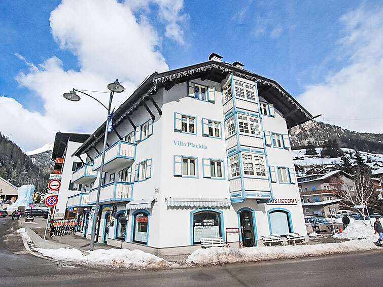 Mooi, comfortabel appartementencomplex "Villa Placidia", van 3 verdiepingen, gerenoveerd. 11 appartementen in de woning. In het centrum van Campitello, 2 km van het centrum van Canazei, drukke, zonnige ligging, 200 m van het skigebied, aan een hoofdweg, op het zuiden. In het huis: centrale verwarming, verwarming alleen beschikbaar van 01.Dec. - 01.Mei.. In de winter sneeuwkettingen aanbevolen. Openbare parkeerplaatsen 500 m extra. Levensmiddelenwinkel 200 m, supermarkt 500 m, restaurant, bar 200 m, bushalte 20 m. Stoeltjeslift 200 m, skibushalte 20 m. Attracties in de buurt: Sella Ronda 400 m, Lago di Carezza 21 km.