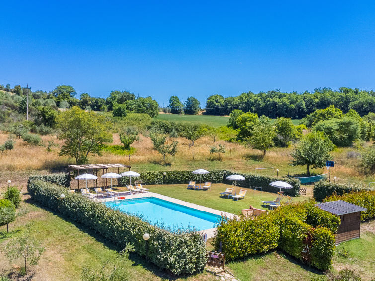 Colle di Val d'Elsa: Groot, comfortabele cottage "Podere San Giuseppe", omgeven door bomen. Huurobject bestaande uit hoofd-/ bijgebouw, 7 km van het centrum van Colle di Val d'Elsa, geïsoleerde, zonnige ligging, 100 m van de bosrand, te midden van groen. Voor alleengebruik: wild terrein, tuin, openluchtzwembad omheind (6 x 12 m, seizoensgebonden beschikbaarheid: 15.Mei. - 30.Sep.). Buitendouche, poolhouse, tafeltennis, patio, terras, tuinmeubelen, barbecue, onderhoud zwembad door de eigenaar/tuinman. In het huis: centrale verwarming, air-conditioning. 1 km lange rommelige toegangsweg. Parkeerplaats bij het huis op het terrein. Bushalte "Colle di Val d'Elsa" 7 km. Auto noodzakelijk. Baby uitrusting (incl.). Groepen jongeren uitsluitend op aanvraag. Geschikt voor evenementen.