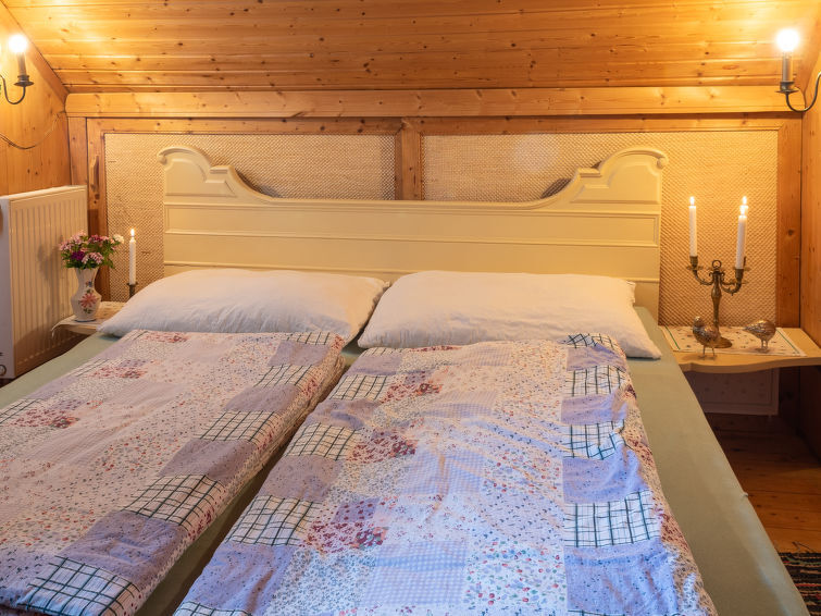 Chalet 4-kamers 120 m2 op 3 verdiepingen. Rustiek en gezellig ingericht: woon-/eetkamer met 1 divanbed, eethoek, Sat-TV, video, radio en tegelkachel. Uitgang naar de zitplaats in de tuin. Kleine, open keuken (4-pits kookplaat, oven, magnetron). Douche/WC. Bovenverdieping: (buitentrap), 2 kamers, elke kamer heeft 1 divanbed, 1 2-pers bed en Sat-TV. Douche/WC. Zolderverdieping: (buitentrap), 1 kamer met 1 divanbed, 1 2-pers bed, wastafel, aparte WC en Sat-TV. Balkon, zithoek in de tuin. Terrasmeubelen, ligstoelen. Mooi uitzicht op het landschap. Maximaal 2 huisdieren/honden toegestaan. Let op: steile buitentrap. Door het behoud van het originele karakter van het huis zijn zowel de deurposten als de hoogte van de ruimtes laag.